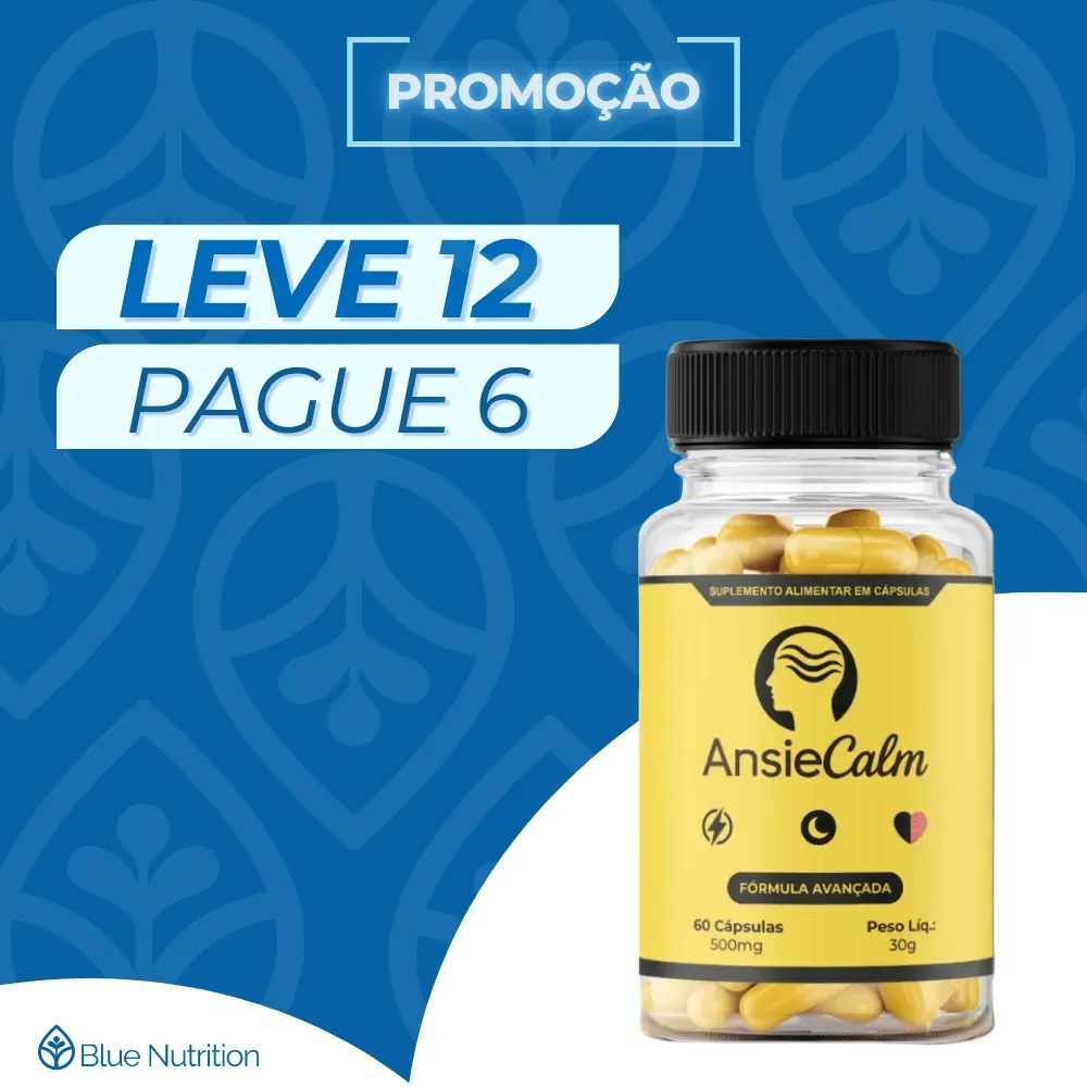 Bem-vindo à Blue Nutrition! AnsieCalm é um suplemento alimentar natural em cápsulas, formulado para promover o equilíbrio emocional e reduzir os sintomas da ansiedade de forma segura e eficaz. Sua combinação de aminoácidos e insumos naturais atua no sistema nervoso central, oferecendo suporte ao bem-estar mental e emocional.