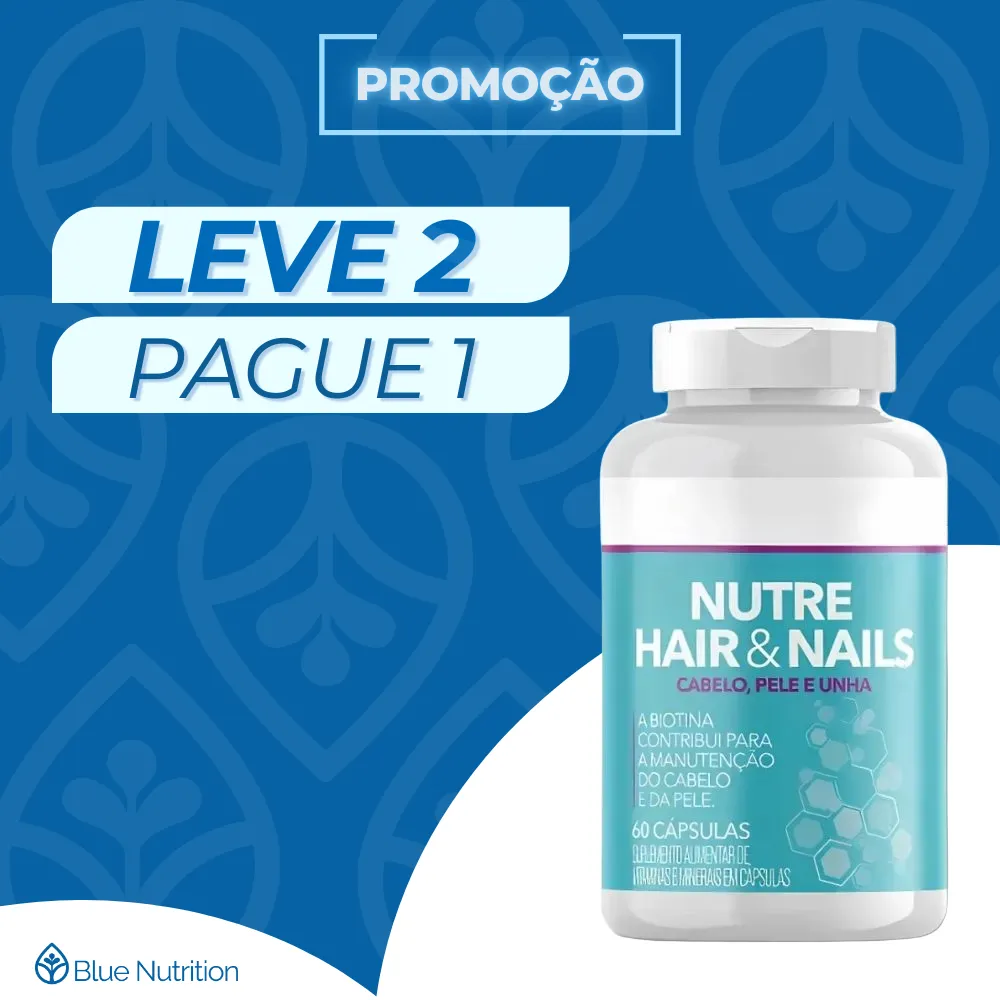 Bem-vindo à Blue Nutrition! O Nutre Hair & Nails é um suplemento alimentar natural em cápsulas, formulado para auxiliar na saúde e beleza dos cabelos, pele e unhas. Contém uma combinação de vitaminas, minerais e aminoácidos que ajudam a fortalecer e revitalizar esses tecidos, promovendo um aspecto mais saudável e vibrante.