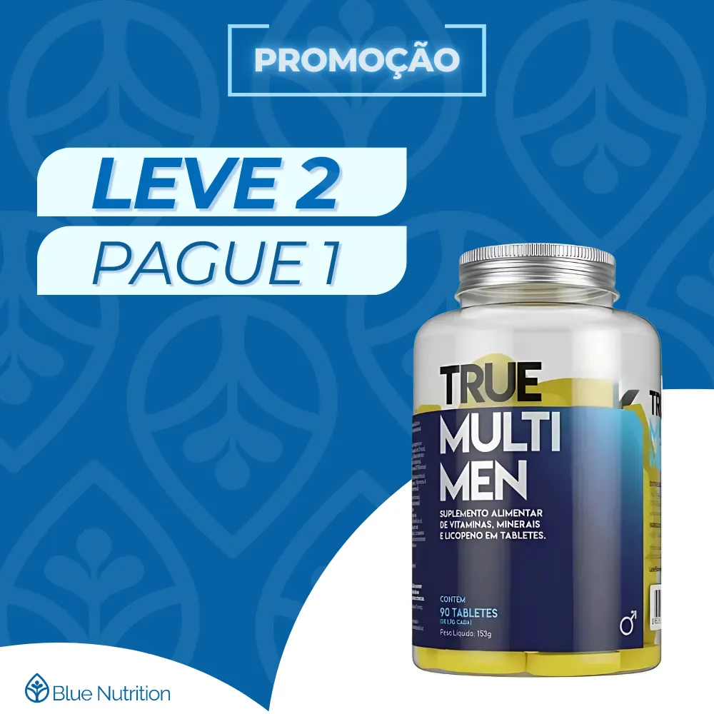 Bem-vindo à Blue Nutrition! O True Multi Men é um suplemento multivitamínico desenvolvido para atender às necessidades nutricionais dos homens adultos. Sua composição inclui uma combinação de vitaminas, minerais e licopeno, visando promover a saúde geral, energia, imunidade e bem-estar masculino.